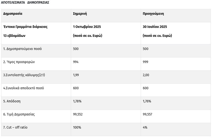 Η δημοπρασία πραγματοποιήθηκε μέσω των Βασικών Διαπραγματευτών Αγοράς (Primary Dealers), και η ημερομηνία διακανονισμού είναι η Παρασκευή 3 Οκτωβρίου 2025.