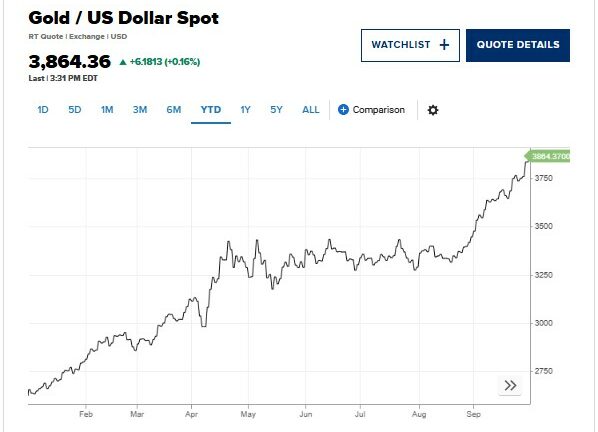 Ο spot χρυσός έφτασε στη διάρκεια της μέρα στο ρεκόρ των 3.894,63 δολαρίων ανά ουγγιά, ενώ τα συμβόλαια μελλοντικής εκπλήρωσης χρυσού στις ΗΠΑ για παράδοση Δεκεμβρίου φτάνουν στο υψηλό των 3.922,70 δολαρίων.