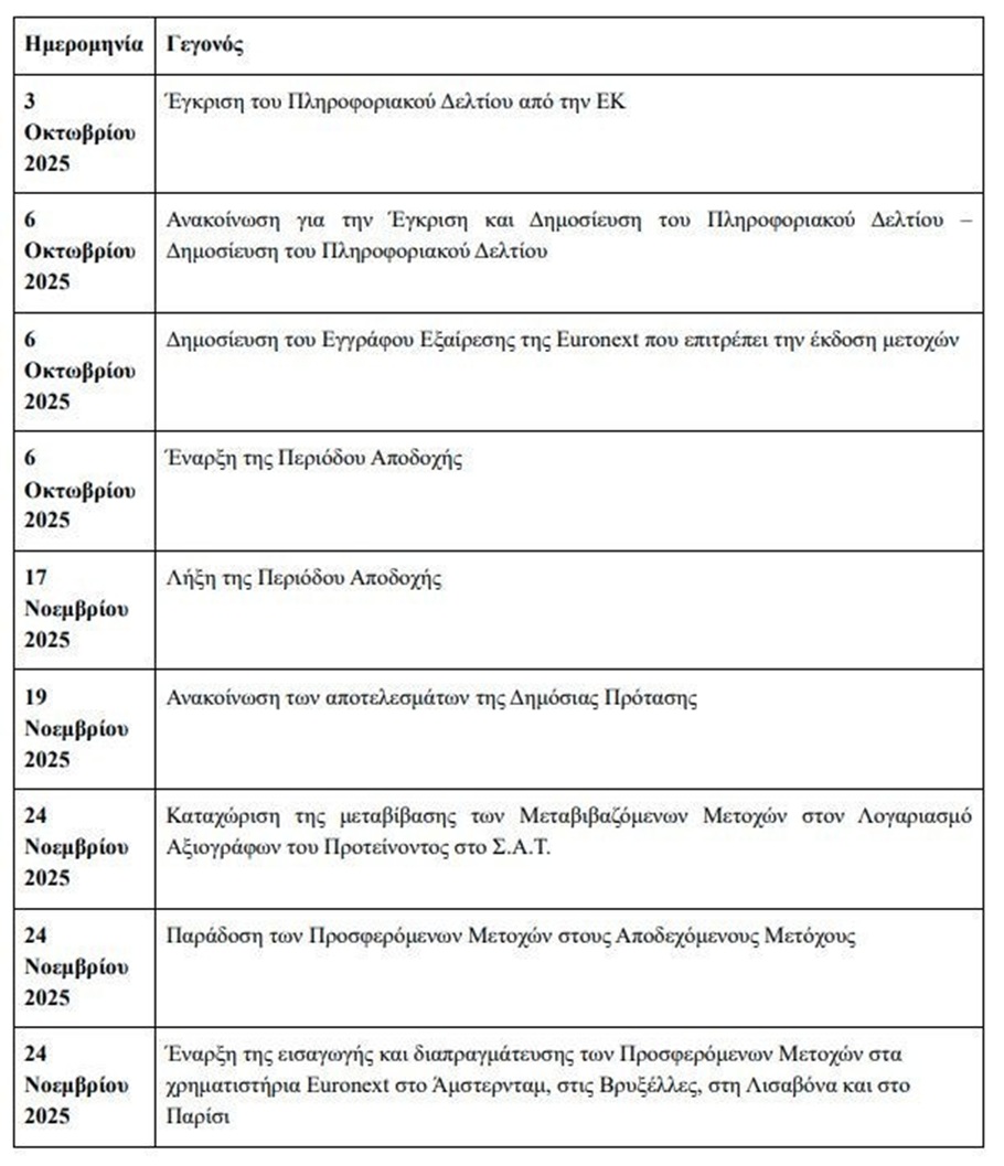 Εκτιμάται ότι τα αποτελέσματα της Δημόσιας Πρότασης θα ανακοινωθούν στις 19 Νοεμβρίου 2025 και η παράδοση των Προσφερόμενων Μετοχών προς τους Αποδεχόμενους Μετόχους θα ολοκληρωθεί κατά ή περίπου στις 24 Νοεμβρίου 2025, υπό την προϋπόθεση ότι έχουν πληρωθεί οι όροι που αναφέρονται στην παράγραφο 7 κατωτέρω.