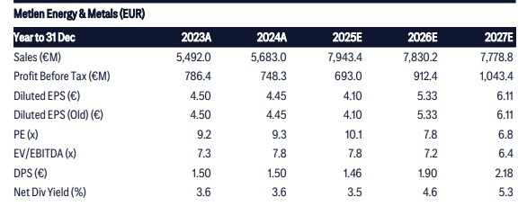 Η Citi διατηρεί σύσταση Buy για τη μετοχή της Metlen, αυξάνοντας την τιμή στόχο στα 52 ευρώ ανά μετοχή, που συνεπάγεται περιθώριο ανόδου περίπου 30% από τα τρέχοντα επίπεδα. Οι αναλυτές της Citi προβλέπουν ότι η κερδοφορία θα φτάσει στα 1,4–1,5 δισ. ευρώ το 2028. Εφόσον η Metlen επιβεβαιώσει το guidance που παρουσίασε στο πρόσφατο CMD, με κερδοφορία 2 δισ. ευρώ από το 2028, κυρίως μέσω των επενδύσεων στον κλάδο των Μετάλλων, η Citi εκτιμά ότι η τιμή στόχος μπορεί να ανέλθει στα 80 ευρώ ανά μετοχή, δηλαδή σχεδόν διπλάσια από τα σημερινά επίπεδα.