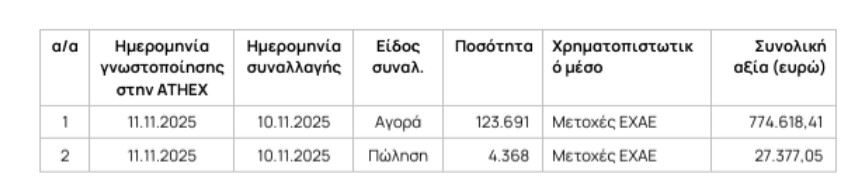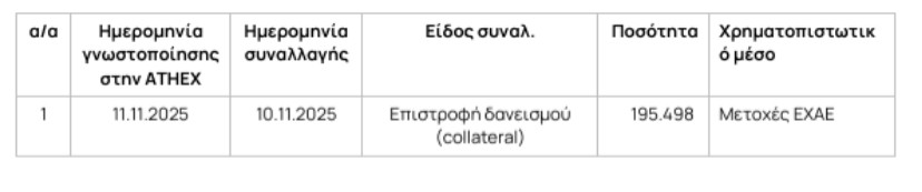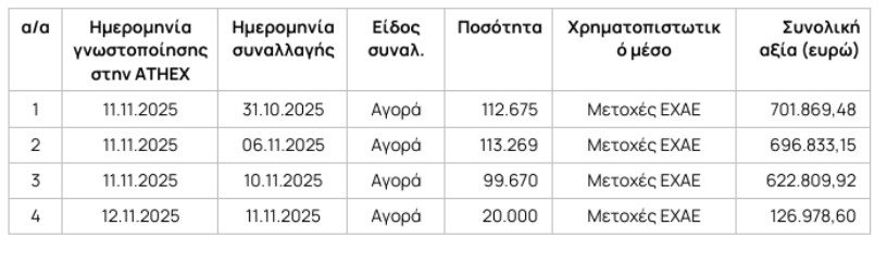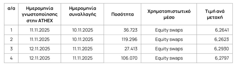 Επίσης, η SOCIETE GENERALE S.A.με γραπτή γνωστοποίηση προς την Εταιρεία ενημέρωσε ότι προέβη στις ακόλουθες συναλλαγές μετοχών της Εταιρείας (σύμβολο ΕΧΑΕ, ISIN GRS395363005):