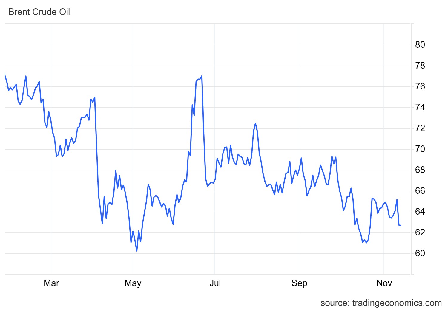 Την Πέμπτη, τα συμβόλαια μελλοντικής εκπλήρωσης του Brent παρέμειναν αμετάβλητα στα 62,71 δολάρια το βαρέλι, μετά από πτώση 3,8% την προηγούμενη ημέρα. Το αμερικανικό αργό West Texas Intermediate σημείωσε μικρή πτώση 0,1%, στα 58,46 δολάρια το βαρέλι, επεκτείνοντας τις απώλειες 4,2% της Τετάρτης. Οι αναλυτές απέδωσαν την πτώση σε στοιχεία που έδειξαν ότι τα αποθέματα αργού στις ΗΠΑ αυξήθηκαν κατά 1,3 εκατομμύρια βαρέλια την εβδομάδα που έληξε στις 7 Νοεμβρίου, ενώ τα αποθέματα βενζίνης και αποσταγμάτων παρουσίασαν μείωση.