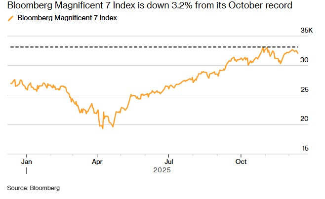 Από τότε που οι αμερικανικές μετοχές έφτασαν στο βραχυπρόθεσμο χαμηλό τους στις 20 Νοεμβρίου, ο δείκτης Russell 2000 μικρής κεφαλαιοποίησης έχει σημειώσει άνοδο 11%, ενώ ένας δείκτης Bloomberg που περιλαμβάνει τις εταιρείες Magnificent Seven κατέγραψε το ήμισυ αυτής της ανόδου.