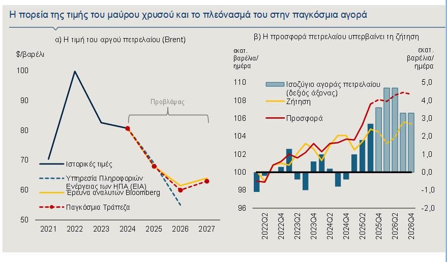 Σύμφωνα με πρόσφατη έκθεση της Παγκόσμιας Τράπεζας (Commodity Markets Outlook, October 2025), οι τιμές του πετρελαίου κατέγραψαν την τέταρτη συνεχόμενη χρονιά πτώσης και εκτιμάται ότι το 2026 θα υποχωρήσουν στο χαμηλότερο επίπεδο των τελευταίων ετών. Ειδικότερα, η τιμή του πετρελαίου Brent προβλέπεται να κυμανθεί, κατά μέσο όρο, στα 68 $/βαρέλι το 2025 που είναι σημαντική υποχώρηση από τα 81$/βαρέλι το 2024, να μειωθεί περαιτέρω στα 60 $/βαρέλι το 2026 και στη συνέχεια να αυξηθεί περίπου στα 65 $/βαρέλι (Γράφημα 1α). Η ισχυρή παγκόσμια προσφορά και η υποτονική αύξηση της παγκόσμιας ζήτησης συνέβαλαν στη δημιουργία πλεονάσματος και συνεπώς στην πτώση των τιμών του μαύρου χρυσού, παρά τις συνεχιζόμενες γεωπολιτικές αναταραχές (IMF, World Economic Outlook, October 2025). Πιο συγκεκριμένα: