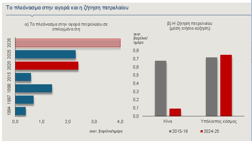 Από την άλλη πλευρά, φέτος, η παγκόσμια οικονομία επηρεάστηκε από την αύξηση των αμερικανικών δασμών που διατάραξε σημαντικά τις εμπορικές ροές και οδήγησε σε επιβράδυνση της αύξησης της ζήτησης πετρελαίου, ιδίως από μεγάλους καταναλωτές ενέργειας, όπως η Κίνα και η Ευρωπαϊκή Ένωση. Επιπλέον, η ευρεία χρήση των ηλεκτρικών οχημάτων, οι βελτιώσεις στην ενεργειακή απόδοση και ο περιορισμός της χρήσης πετρελαίου στα ενεργειακά συστήματα μείωσαν διαρθρωτικά τη ζήτηση πετρελαίου (Energy Market Outlook 2026, ABN AMRO, November 2025). Η Παγκόσμια Τράπεζα (Commodity Markets Outlook, October 2025) εκτιμά ότι η ζήτηση πετρελαίου αυξήθηκε μόνο κατά 0,8 εκατ. βαρέλια την ημέρα (0,7% σε ετήσια βάση) το τρίτο τρίμηνο του 2025, αντανακλώντας υποτονικότερη ζήτηση σε σχέση με τα προηγούμενα έτη. Ειδικά, όσον αφορά την Κίνα που είναι από τους μεγαλύτερους καταναλωτές ενέργειας παγκοσμίως, τα τελευταία δύο χρόνια, η αύξηση της ζήτησης πετρελαίου ήταν σημαντικά χαμηλότερη από τον μέσο όρο της περιόδου 2015-19, επηρεάζοντας πτωτικά τις τιμές του, ενώ η αύξηση στον υπόλοιπο κόσμο παρέμεινε σε γενικές γραμμές σταθερή (Γράφημα 2β). Η τάση αυτή αναμένεται να συνεχισθεί και το 2026, δηλαδή η κατανάλωση πετρελαίου στις προηγμένες οικονομίες προβλέπεται να παραμείνει σχετικά σταθερή, ενώ η αύξηση στην Κίνα θα είναι πιθανώς μέτρια, λόγω και της επιταχυνόμενης υιοθέτησης ηλεκτρικών και υβριδικών οχημάτων.