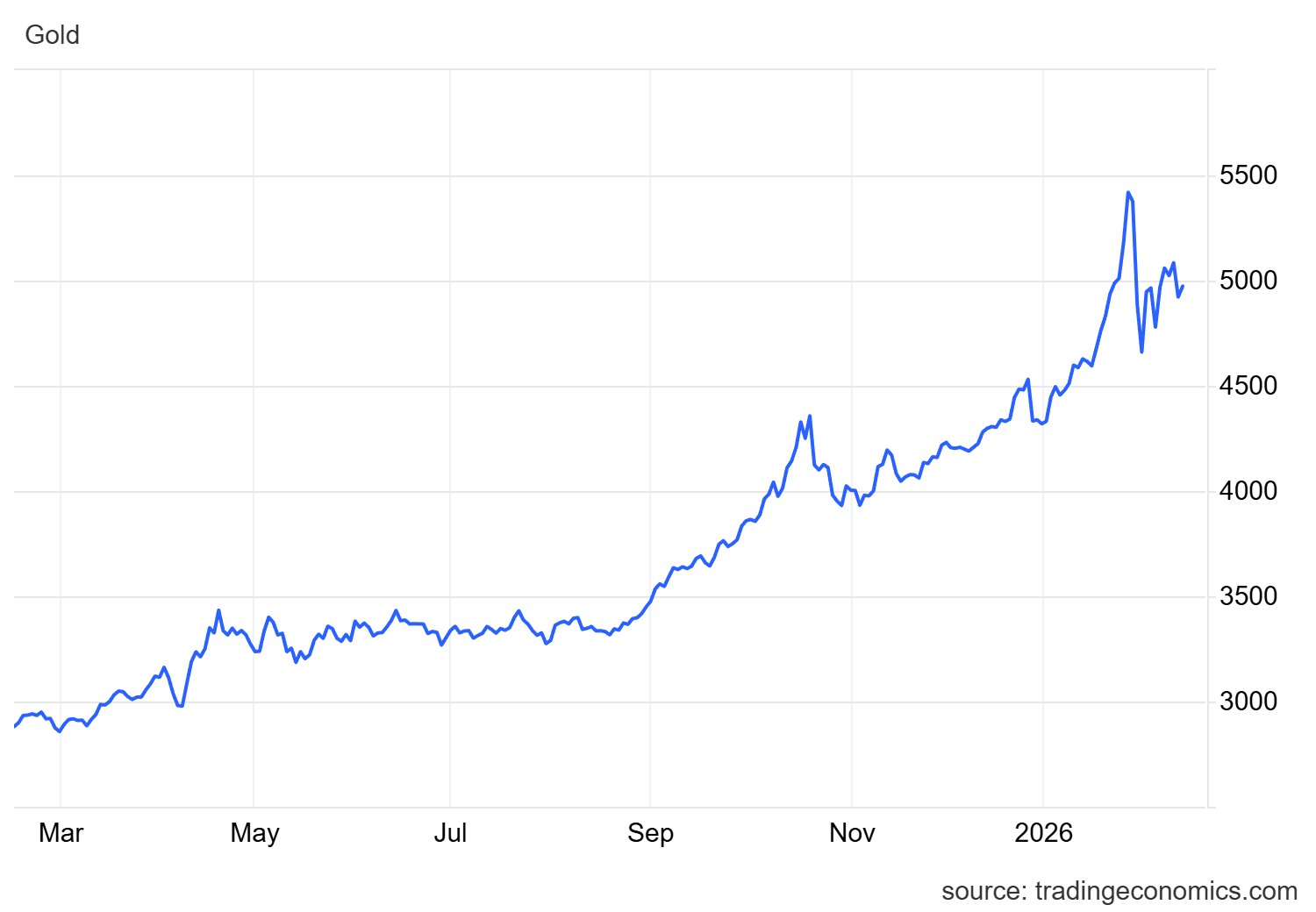 Την 29η Ιανουαρίου, η τιμή του χρυσού έφτασε σε ιστορικό υψηλό, στα 5.594 δολάρια ανά ουγγιά, για να υποχωρήσει σχεδόν 10% την επόμενη ημέρα – καταγράφοντας τη μεγαλύτερη ημερήσια πτώση των τελευταίων δεκαετιών. Από τότε, το πολύτιμο μέταλλο αγωνίζεται να σταθεροποιηθεί πάνω από τα 5.000 δολάρια.