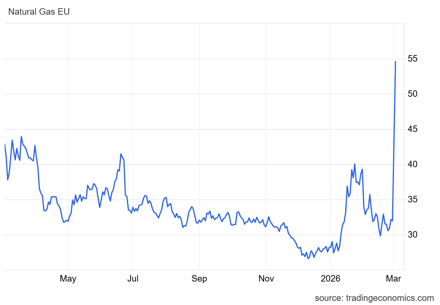 Το ολλανδικό συμβόλαιο TTF για τον επόμενο μήνα αρχικά αυξήθηκαν κατά 36%, φτάνοντας τα 58 ευρώ ανά μεγαβατώρα στις πρώτες συναλλαγές, στο υψηλότερο επίπεδο από τον Ιανουάριο του 2023. Η άνοδος αυτή επιταχύνθηκε λόγω των αυξανόμενων εντάσεων στη Μέση Ανατολή, οι οποίες θέτουν σε κίνδυνο τον εφοδιασμό της Ευρώπης με υγροποιημένο φυσικό αέριο. Οι τιμές είχαν ήδη αρχίσει να ανεβαίνουν από τη Δευτέρα, μετά την αναστολή παραγωγής στο συγκρότημα Ras Laffan από την κρατική QatarEnergy, έπειτα από επίθεση με ιρανικά drones.