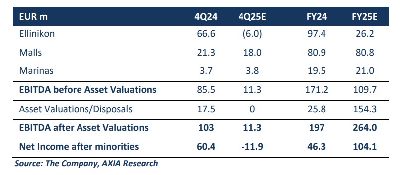 Για το τέταρτο τρίμηνο, η AXIA – Alpha Finance αναμένει ότι ο όμιλος θα ανακοινώσει έσοδα 147,5 εκατ. ευρώ έναντι 250,9 εκατ. ευρώ πέρυσι, με το EBITDA προ αναπροσαρμογών να διαμορφώνεται στα 19,3 εκατ. ευρώ, έναντι 85,5 εκατ. ευρώ πέρυσι. Εκτιμά ότι τα καθαρά έσοδα θα διαμορφωθούν σε 19,3 εκατ. ευρώ έναντι 85,5 εκατ. ευρώ το 4ο τρίμηνο του 2024. Για το οικονομικό έτος 2025, αναμένει συνολικά έσοδα 589,3 εκατ. ευρώ (610,6 εκατ. ευρώ το οικονομικό έτος 2024), με αποτέλεσμα συνολικό EBITDA προ αποτιμήσεων 109,7 εκατ. ευρώ (171,2 εκατ. ευρώ το οικονομικό έτος 2024) και καθαρά έσοδα μετά από μειοψηφίες 104,1 εκατ. ευρώ (έναντι 46,3 εκατ. ευρώ το οικονομικό έτος 2024).