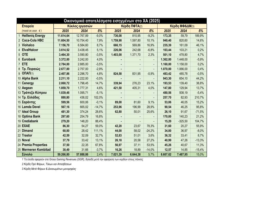 Θετικά αποτελέσματα εμφανίζουν για το 2025 οι εισηγμένες εταιρείες στο ΧΑ. Η πρώτη φουρνιά οικονομικών αποτελεσμάτων που έχουν δημοσιοποιηθεί μέχρι σήμερα, δείχνει μικρή μονοψήφια αύξηση εσόδων, μέτρια μονοψήφια αύξηση λειτουργικών κερδών (EBITDA) και ισχυρή διψήφια αύξηση καθαρών κερδών μετά από φόρους.