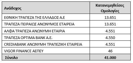 Επίσης, από τις 50.000 Ομολογίες που κατανεμήθηκαν σε Ειδικούς Επενδυτές, οι Ανάδοχοι έλαβαν για δικό τους λογαριασμό 41.000 Ομολογίες ως ακολούθως: