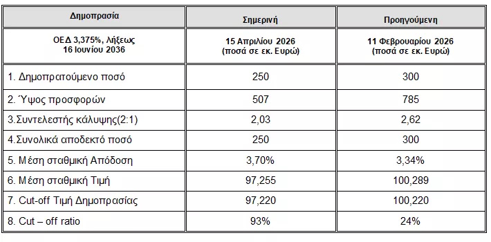 Οι συνολικές προσφορές ανήλθαν σε 507 εκατ. ευρώ και η ημερομηνία διακανονισμού είναι η Τετάρτη 22 Απριλίου 2026.