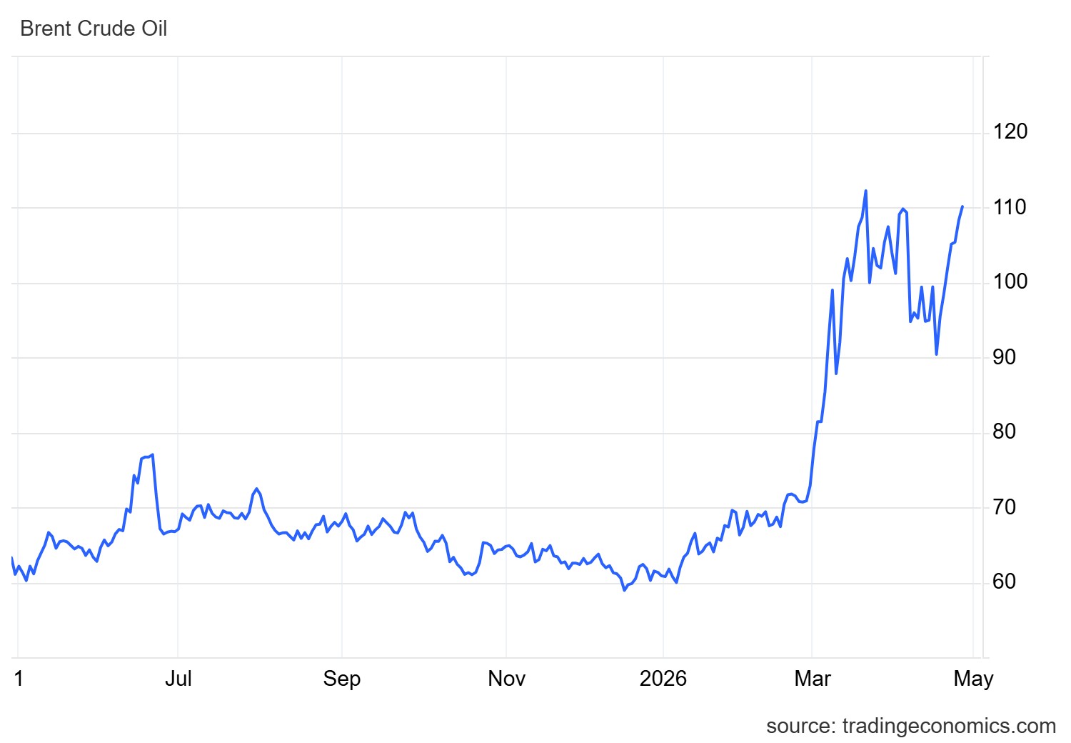 Τα συμβόλαια μελλοντικής εκπλήρωσης για το πετρέλαιο Brent για τον Ιούνιο ξεπέρασαν στα 110 δολάρια το βαρέλι (+1,72%), μετά από άνοδο 2,8% στην προηγούμενη συνεδρίαση, στο υψηλότερο κλείσιμο από τις 7 Απριλίου. Το συμβόλαιο σημειώνει άνοδο για έβδομη συνεχόμενη ημέρα.