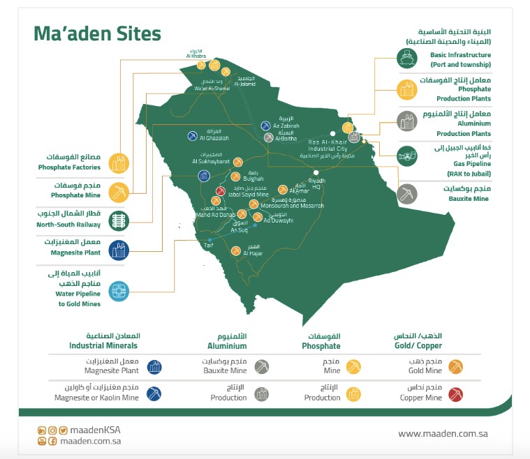 Το μεταλλείο Μπιρ Ουμκ στην πόλη Μαχντ Αλ-Νταχάμπ στα δυτικά, όπου οι Ajlan & Bros και Norin Mining θα επενδύσουν 110 εκατ. ριάλ (29,33 εκατ. δολάρια), καλύπτει πάνω από 187 τετραγωνικά χιλιόμετρα σε μία περιοχή πλούσια σε χαλκό και ψευδάργυρο. Το Τζαμπάλ Σαχαμπίγια στο νότο, το οποίο θα εκμεταλλευθεί το κονσόρτσιουμ Royal Roads και MSB Holding με πάνω από 20 εκατ. ριάλ, απλώνεται σε 283 τ.χλμ. με ψευδάργυρο, μόλυβδο και χαλκό. Και το κονσόρτσιουμ των εταιρειών Sumou Holding και Kuya Silver θα ρίξει περί τα 83 εκατ. ριάλ στο μεταλλείο Ουμ Χαντίντ σε έκταση 246 τ.χλμ. και το οποίο είναι πλούσιο σε ασήμι, μόλυβδο, χαλκό και ψευδάργυρο.
