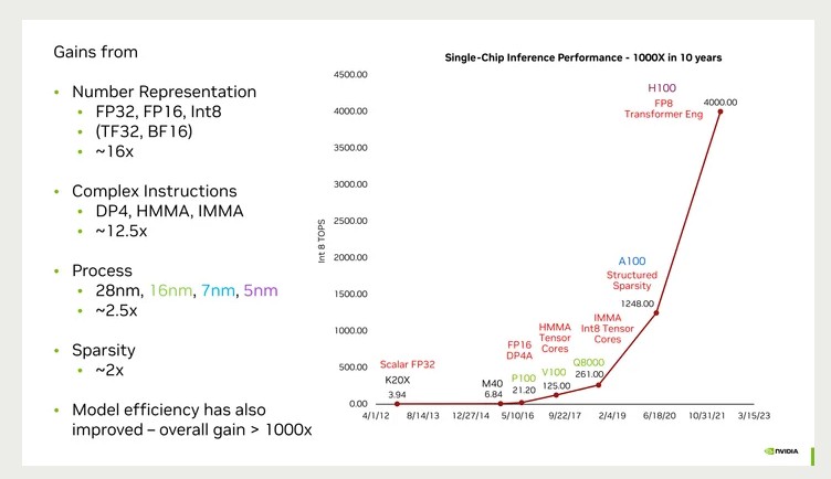 Στις 29 Αυγούστου του 2023 ο επικεφαλής επιστήμονας της Nvidia, Μπιλ Ντάιλι, μιλώντας στο συνέδριο «Hot Chips 2023» του Institute of Electrical and Electronics Engineers (Ινστιτούτο Ηλεκτρολόγων και Ηλεκτρονικών Mηχανικών) στη Σίλικον Βάλεϊ, εξήγησε πώς οι μικροεπεξεργαστές της εταιρείας εκατονταπλασίασαν την απόδοσή τους σε καθήκοντα τεχνητής νοημοσύνης μέσα στην τελευταία δεκαετία.