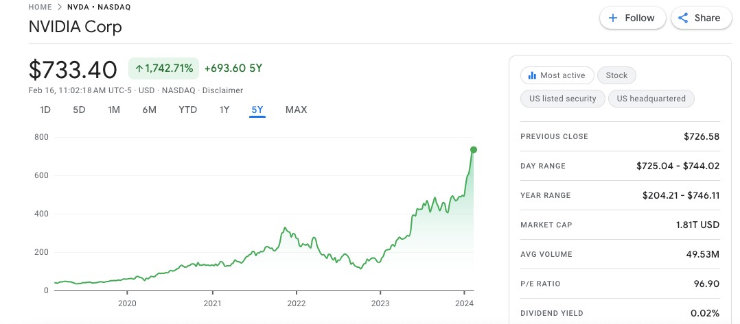 Ράλι δίχως τέλος κατέγραψε η μετοχή της Nvidia την περασμένη εβδομάδα, ακολουθώντας την ξέφρενη πορεία εκτίναξης της αξίας της, που ενισχύθηκε ιδιαίτερα εντός του 2023. Είχαν προηγηθεί τα εξής ορόσημα: την Τρίτη ξεπέρασε σε χρηματιστηριακή αξία την Amazon για πρώτη φορά από το 2002. Την Τετάρτη η μετοχή της έκλεισε με άνοδο της τάξεως του 2,5% και η κεφαλαιοποίησή της διαμορφώθηκε στο 1,83 τρισ. δολάρια, ξεπερνώντας την αξία της μητρικής της Google, Alphabet (στο 1,82 τρισ. δολάρια). Καθιστώντας έτσι την Nvidia την τέταρτη πιο πολύτιμη εταιρεία στον κόσμο, πλησιάζοντας πλέον τη Saudi Aramco, η οποία αποτιμάται σε περίπου 2 τρισ. δολάρια. Την Παρασκευή η τιμή της μετοχής της Nvidia κυμαινόταν μεταξύ 725 και 744 δολαρίων και η κεφαλαιοποίησή της στο 1,81 τρισ. δολάρια, με το παρακάτω γράφημα να απεικονίζει την ανοδική της πορεία σε βάθος πενταετίας.