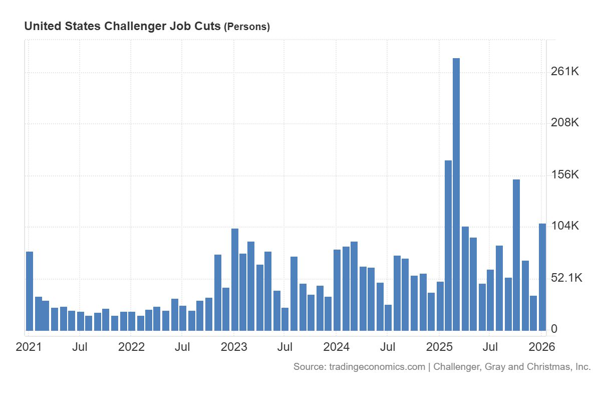 Οι εργοδότες στις ΗΠΑ ανακοίνωσαν 108.435 περικοπές θέσεων εργασίας τον Ιανουάριο, το υψηλότερο επίπεδο από τον Οκτώβριο και το μεγαλύτερο σύνολο Ιανουαρίου από το 2009, σε σύγκριση με 33.553 περικοπές που ανακοινώθηκαν τον Δεκέμβριο.