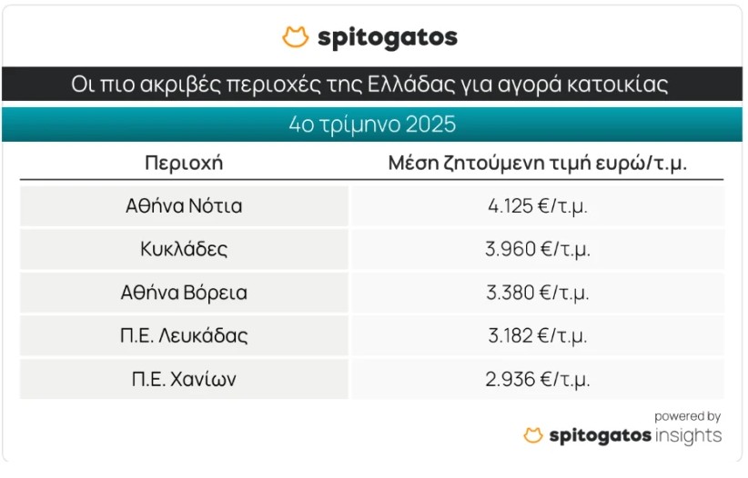 Τα Νότια Προάστια της Αττικής διατηρούν τα πρωτεία ως η ακριβότερη περιοχή της χώρας για αγορά κατοικίας, με μέση ζητούμενη τιμή 4.125 ευρώ/τ.μ. Ακολουθούν οι Κυκλάδες και τα Βόρεια Προάστια ενώ την πρώτη πεντάδα συμπληρώνουν η Π.Ε. Λευκάδας και η Π.Ε. Χανίων.