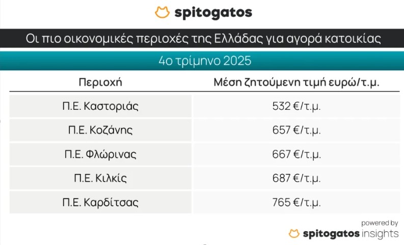Στον αντίποδα, οι χαμηλότερες τιμές πώλησης εντοπίζονται στην Π.Ε. Καστοριάς (532 ευρώ/τ.μ.), ενώ ακολουθούν οι Π.Ε. Κοζάνης, Φλώρινας , Κιλκίς και Καρδίτσας.