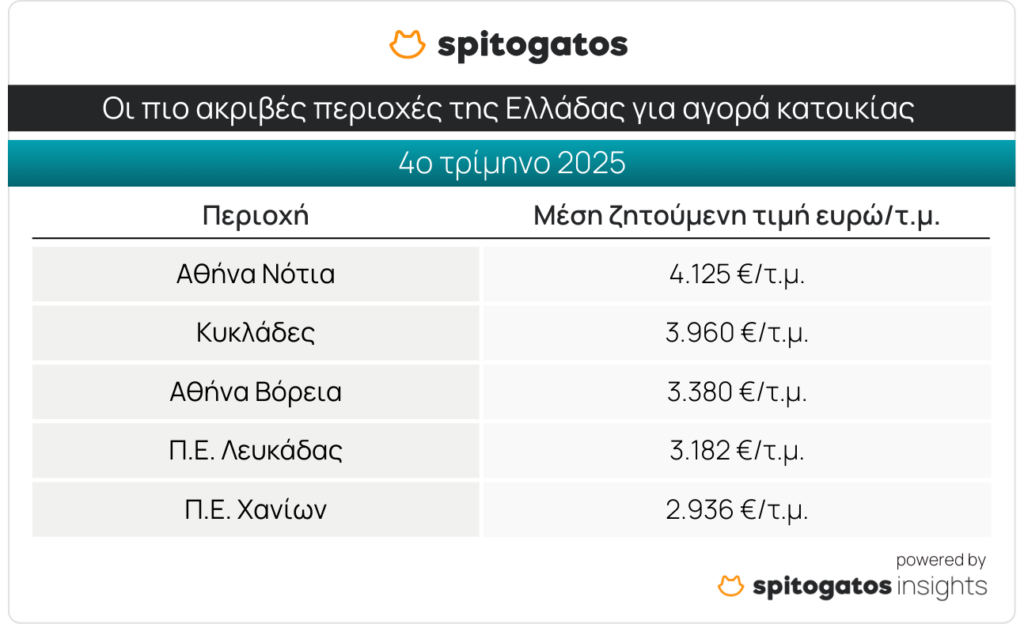 Τα πρωτεία των πιο ακριβών περιοχών της χώρας για αγορά κατοικίας συνεχίζουν να κατέχουν τα Νότια Προάστια, με ΜΖΤ στα 4.125 ευρώ/τ.μ., ενώ ακολουθούν οι Κυκλάδες και τα Βόρεια Προάστια. Το top 5 των πιο ακριβών σημείων της χώρας για αγορά κατοικίας συμπληρώνουν η Περιφερειακή Ενότητα (Π.Ε.) Λευκάδας και η Π.Ε. Χανίων, με ΜΖΤ στα 2.936 ευρώ/τ.μ.