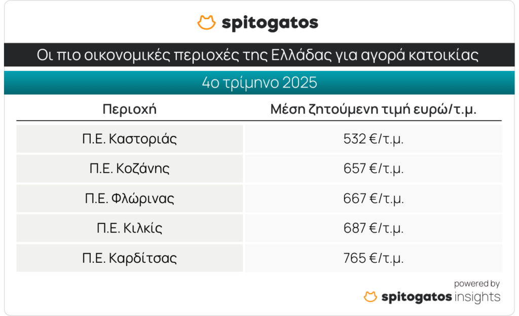 Στον αντίποδα, τα πιο οικονομικά σημεία της χώρας για αγορά κατοικίας είναι η Π.Ε. Καστοριάς με ΜΖΤ πώλησης κατοικίας στα 532 ευρώ/τ.μ., ενώ ακολουθούν οι Π.Ε. Κοζάνης, Φλώρινας, Κιλκίς και Καρδίτσας.