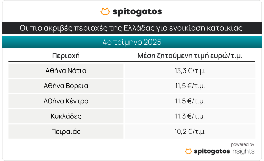 Στον τομέα της ενοικίασης κατοικίας, τα πιο ακριβά σημεία της χώρας είναι και πάλι τα Νότια Προάστια, ενώ στη 2η θέση του top 5 των πιο ακριβών περιοχών κατατάσσονται τα Βόρεια Προάστια. Ακολουθούν ο Δήμος Αθηναίων, οι Κυκλάδες και ο Πειραιάς, με ΜΖΤ ενοικίασης κατοικίας στα 10,2 ευρώ/τ.μ.