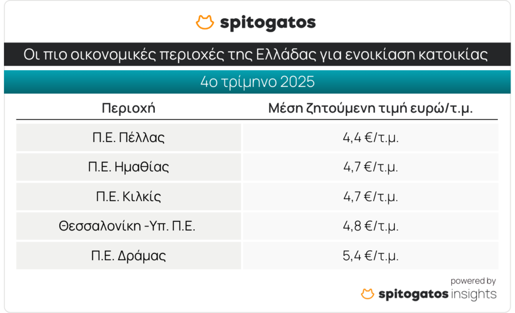 Τα οικονομικότερα σημεία της Ελλάδας για ενοικίαση κατοικίας κατά το 4ο τρίμηνο του 2025 είναι οι Π.Ε. Πέλλας, Ημαθίας, Κιλκίς, το Υπόλοιπο της Περιφερειακής Ενότητας Θεσσαλονίκης και η Π.Ε. Δράμας.