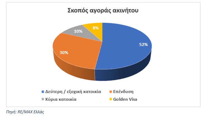 Έτσι, εκτός από το κίνητρο αγοράς για χρήση του ακινήτου ως δεύτερη/εξοχική κατοικία οι ξένοι αγοραστές επέλεξαν σε ποσοστό 30% ένα ακίνητο για επενδυτική χρήση (εκμίσθωση ή μεταπώληση), ενώ ένα 10% προχώρησε σε αγορά κύριας κατοικίας. Με ποσοστό μόλις 8%, η Golden Visa εξακολουθεί να καταγράφεται ως κίνητρο αγοράς κατοικίας στη χώρα μας, αλλά δεν αποτελεί πλέον τον κύριο μοχλό της ζήτησης από το εξωτερικό.