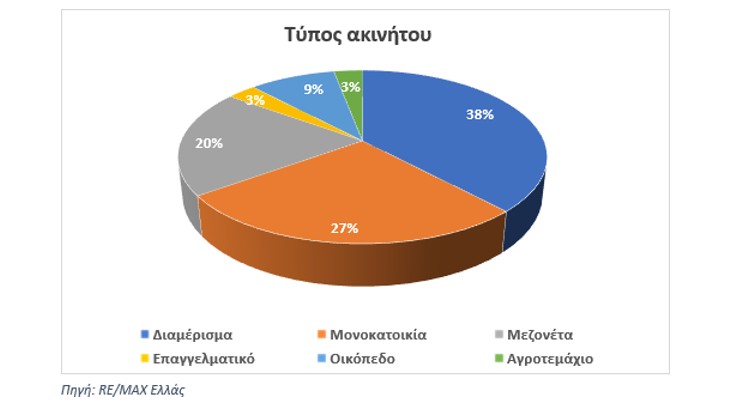 Με βάση τα στοιχεία της έρευνας της RE/MAX Ελλάς για το 2025, οι προτιμήσεις των ξένων αγοραστών ως προς τον τύπο ακινήτου ποικίλλουν. Τα διαμερίσματα καλύπτουν το 38% των αγορών, με τις μονοκατοικίες να ακολουθούν στο 27% και τις μεζονέτες στο 20%. Στο 3% περιορίζονται οι αγορές επαγγελματικών ακινήτων, ενώ τα οικόπεδα αντιστοιχούν στο 9% και τα αγροτεμάχια στο 3%.