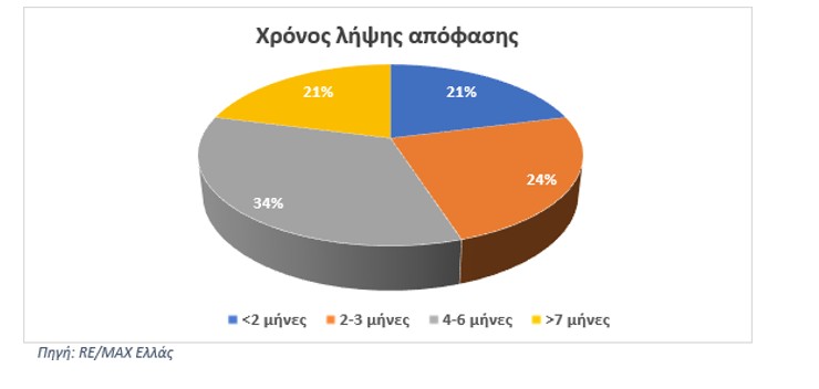 Τέλος, σημαντικές διαφοροποιήσεις εντοπίζονται και στο χρόνο λήψης της οριστικής απόφασης για την απόκτηση ενός ακινήτου από τους ξένους αγοραστές. Το 34% των υποψήφιων αγοραστών αποφασίζει μέσα σε 4 – 6 μήνες, ενώ το 24% καταλήγει σε απόφαση εντός 2 – 3 μηνών.
