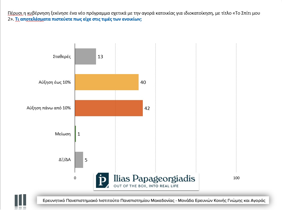 Τέλος, ιδιαίτερο ενδιαφέρον παρουσιάζουν και τα ευρήματα για το πρόγραμμα «Το Σπίτι μου 2». Το 77% των πολιτών θεωρεί ότι το πρόγραμμα οδήγησε σε άνοδο των τιμών πώλησης των κατοικιών, με σχεδόν τέσσερις στους δέκα να μιλούν για αύξηση άνω του 10% και ένα αντίστοιχο ποσοστό για αύξηση έως 10%. Μόλις το 13% εκτιμά ότι οι τιμές παρέμειναν σταθερές και το 2% ότι μειώθηκαν. Ακόμη πιο έντονη είναι η εικόνα στα ενοίκια, όπου το 82% θεωρεί ότι αυξήθηκαν έως ή και πάνω από 10%, με το ποσοστό αυτό να φτάνει το 87% στην ομάδα των ενεργών αγοραστών που αναζητούν κατοικία.