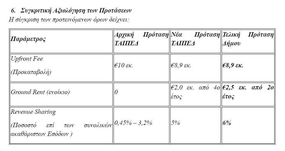 - την καταβολή ενοικίου 2,0 εκατ. ευρώ από το 4ο έτος ή (διαζευκτικά) διαμοιρασμό εσόδων 5% από το 6ο έτος και μετά.