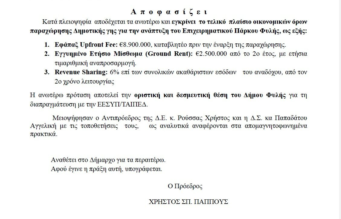Και η πρόταση αυτή απορρίφθηκε από τον Δήμο Φυλής στις αρχές του περασμένου Ιανουαρίου. Σύμφωνα με τη σχετική απόφαση του Δήμου, η νέα βελτιωμένη πρόταση του Υπερταμείου κινείται οριακά προς τη σωστή κατεύθυνση, αλλά υστερεί στο ύψος του ετησίου μισθώματος, καθυστερεί την έναρξη των πληρωμών και δεν αποδίδει πλήρως την πραγματική αξία του οικοπέδου.
