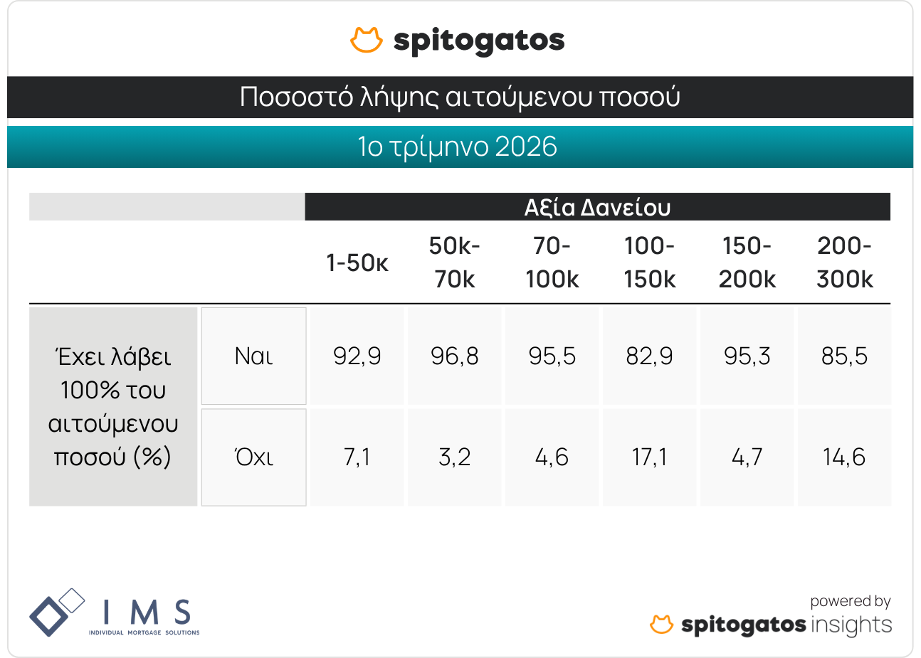 Εξετάζοντας περαιτέρω τα στοιχεία του 1ου τριμήνου του 2026, αποτυπώνεται μια συνολικά ισχυρή εικόνα έγκρισης στεγαστικών δανείων στην ελληνική αγορά ακινήτων, καθώς η μεγάλη πλειονότητα των δανειοληπτών έλαβε το 100% του αιτούμενου ποσού στις περισσότερες κατηγορίες δανείου.