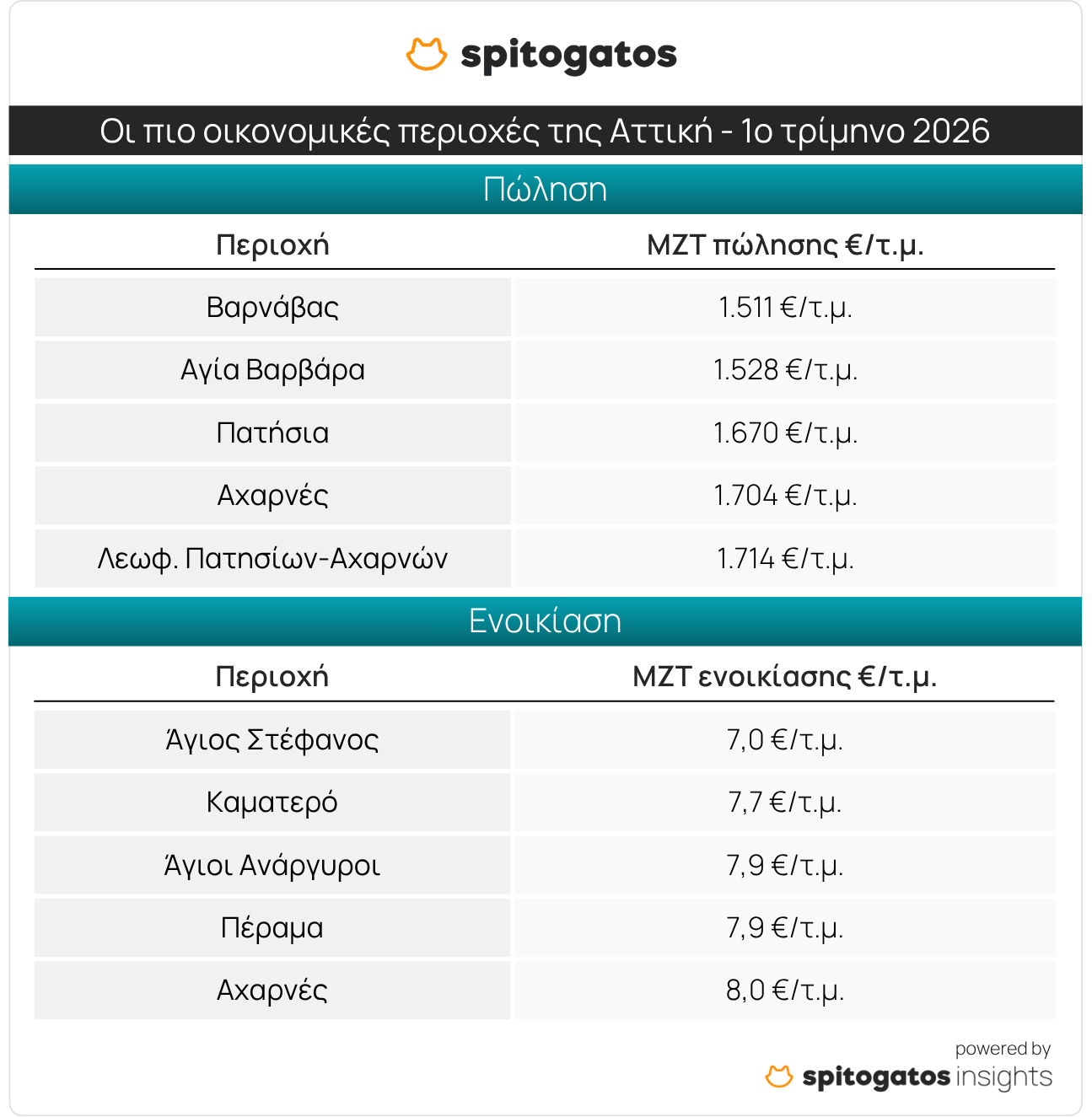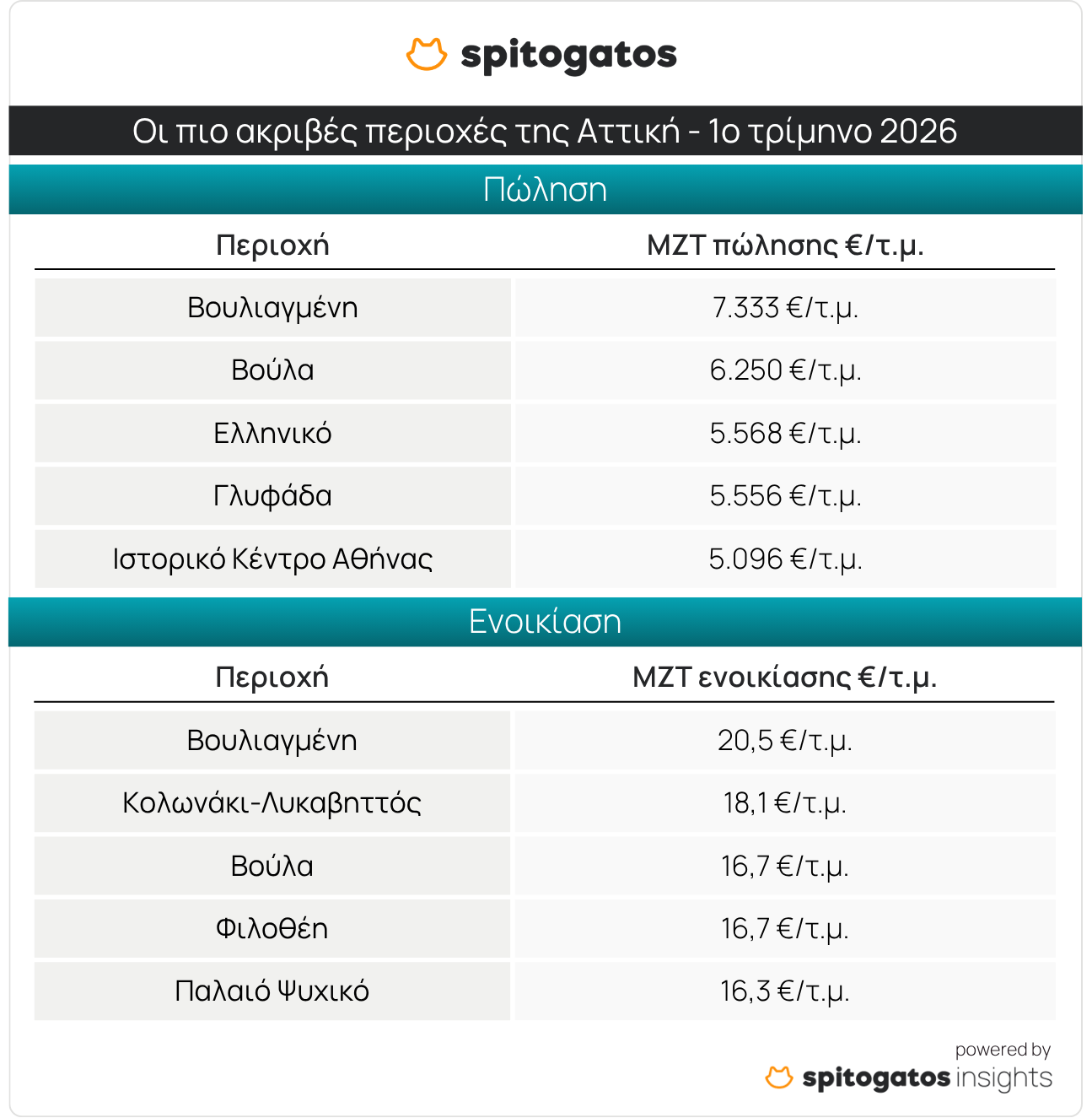 Το Spitogatos Insights εξέτασε την εξέλιξη των ΜΖΤ πώλησης και ενοικίασης κατοικιών στην Αττική κατά το 1ο τρίμηνο του 2026. Σύμφωνα με τα πρόσφατα στοιχεία, τα Νότια Προάστια σχεδόν μονοπωλούν το top 5 των πιο ακριβών περιοχών της Αττικής, με τη Βουλιαγμένη να βρίσκεται στην κορυφή με ΜΖΤ 7.333 ευρώ/τ.μ., ενώ ακολουθούν η Βούλα, το Ελληνικό, η Γλυφάδα και το Ιστορικό Κέντρο της Αθήνας, όπως φαίνεται στον παρακάτω πίνακα.