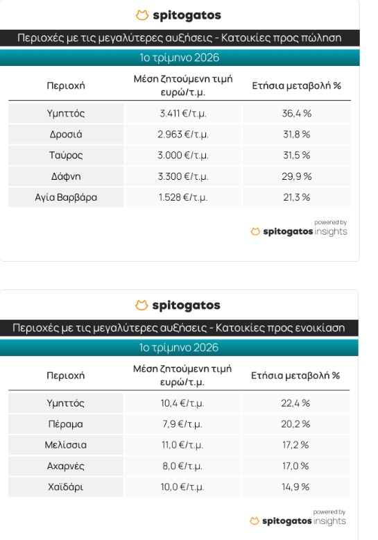 Οι περιοχές που ξεχώρισαν κατά το 1ο τρίμηνο του 2026 για τις σημαντικές αυξήσεις που σημείωσαν στη ΜΖΤ πώλησης κατοικίας σε σχέση με το αντίστοιχο τρίμηνο του 2025 είναι η περιοχή του Υμηττού, ενώ ακολουθούν η Δροσιά, ο Ταύρος, η Δάφνη και η Αγία Βαρβάρα.