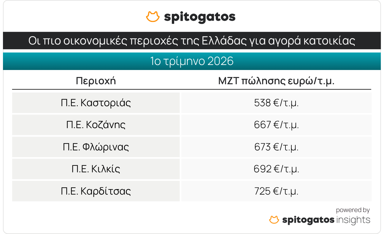 Στον αντίποδα, οι πιο οικονομικές περιοχές της χώρας για αγορά κατοικίας είναι οι εξής: η Π.Ε. Καστοριάς με ΜΖΤ πώλησης στα 538 ευρώ/τ.μ., η Π.Ε. Κοζάνης, η Π.Ε. Φλώρινας, η Π.Ε. Κιλκίς και η Π.Ε. Καρδίτσας.