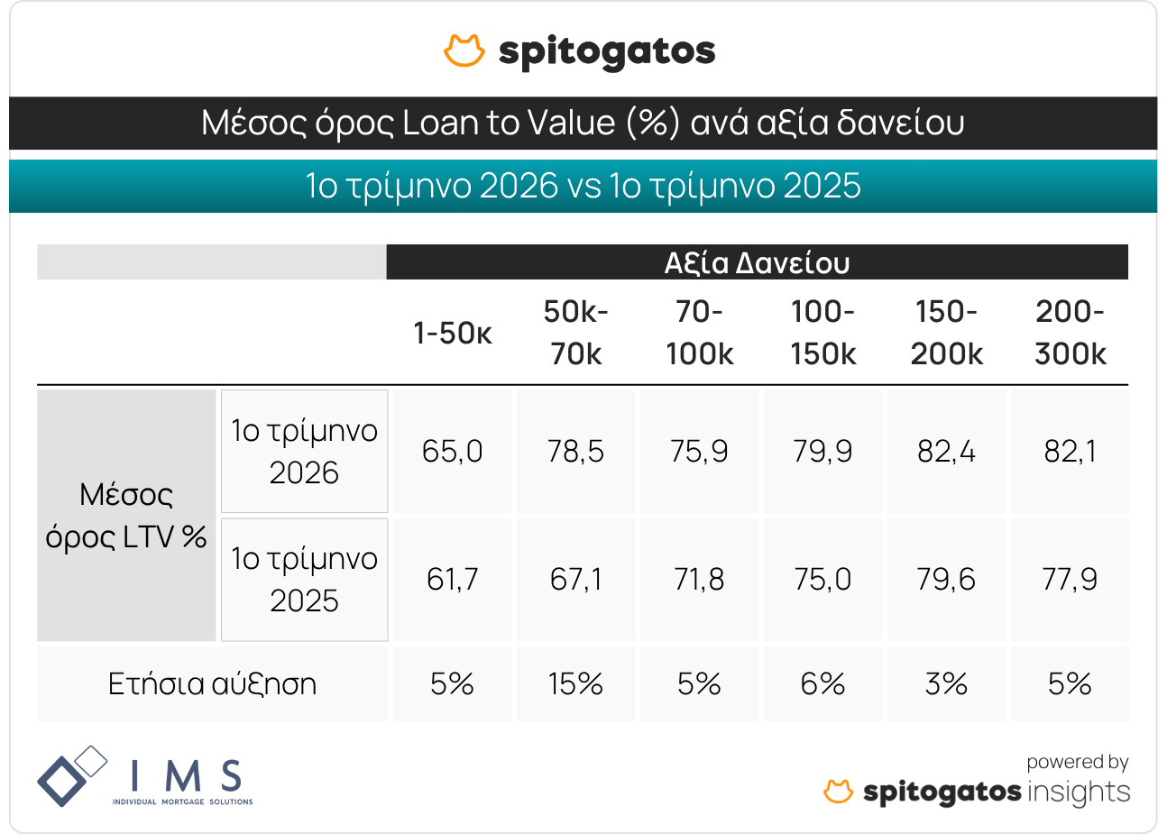 Είναι σημαντικό να σημειωθεί ότι ο δείκτης LTV είναι αυξημένος κατά το 1ο τρίμηνο του 2026 σε όλες τις βαθμίδες αξίας δανείου, με τη σημαντικότερη αύξηση να σημειώνεται στη βαθμίδα 50-70 χιλιάδες ευρώ.