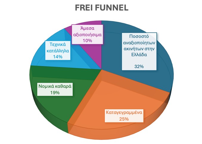 Με βάση το διάγραμμα του Frei Funnel που αξιοποιεί κατά την διαδικασία ψηφιακής χαρτογράφησης και αξιολόγησης ακινήτων η BluPeak Estate Analytics, το 32% αφορά το συνολικό απόθεμα των ακινήτων που παραμένουν αναξιοποίητα από το σύνολο των ακινήτων που υφίστανται στην Ελλάδα. Από αυτή τη δεξαμενή, μόλις το 25% εμφανίζεται ως καταγεγραμμένο, γεγονός που δείχνει ήδη μια πρώτη απώλεια ορατότητας και οργανωμένης πληροφόρησης για την πραγματική κατάσταση της αγοράς.