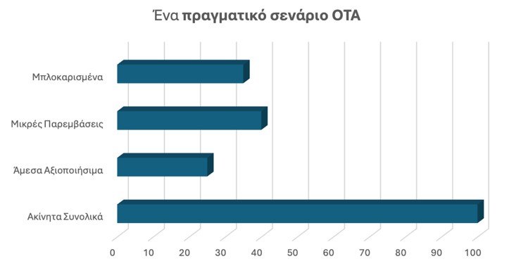 Η μεγάλη εικόνα της δημοτικής ακίνητης περιουσίας συχνά δημιουργεί την εντύπωση ότι οι ΟΤΑ διαθέτουν σημαντικά περιθώρια παρέμβασης στο στεγαστικό και στην τοπική ανάπτυξη. Όμως η πραγματικότητα είναι πολύ πιο σύνθετη. Το ενδεικτικό σενάριο που αποτυπώνεται στο σχετικό γράφημα που παραθέτει η BluPeak Estate Analytics δείχνει ότι από ένα σύνολο 100 ακινήτων, μόνο ένα μικρό μέρος μπορεί να αξιοποιηθεί άμεσα, ενώ ένα σημαντικό ποσοστό παραμένει παγωμένο ή χρειάζεται προηγουμένως διορθωτικές κινήσεις.