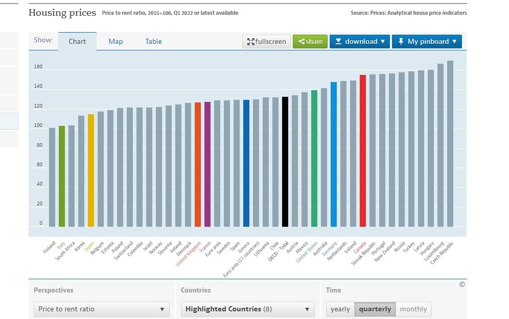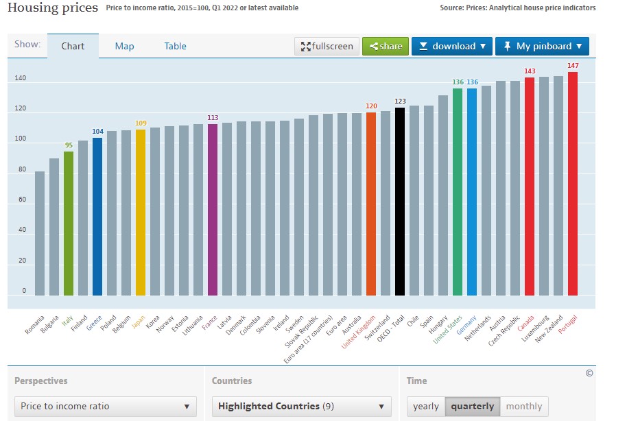 Όσον αφορά στην τιμή των ακινήτων σε αναλογία με το κατά κεφαλήν εισόδημα, ένα κλάσμα που δείχνει πόσο προσιτή ή όχι είναι η αγορά μίας κατοικίας, η Ελλάδα βρίσκεται σε σαφώς χαμηλότερη θέση, 34 μεταξύ 38 κρατών του ΟΟΣΑ, με πρώτη την Πορτογαλία, τη Νέα Ζηλανδία, το Λουξεμβούργο, τον Καναδά, την Τσεχία και την Αυστρία, ενώ ακολουθούν Ολλανδία και Γερμανία.