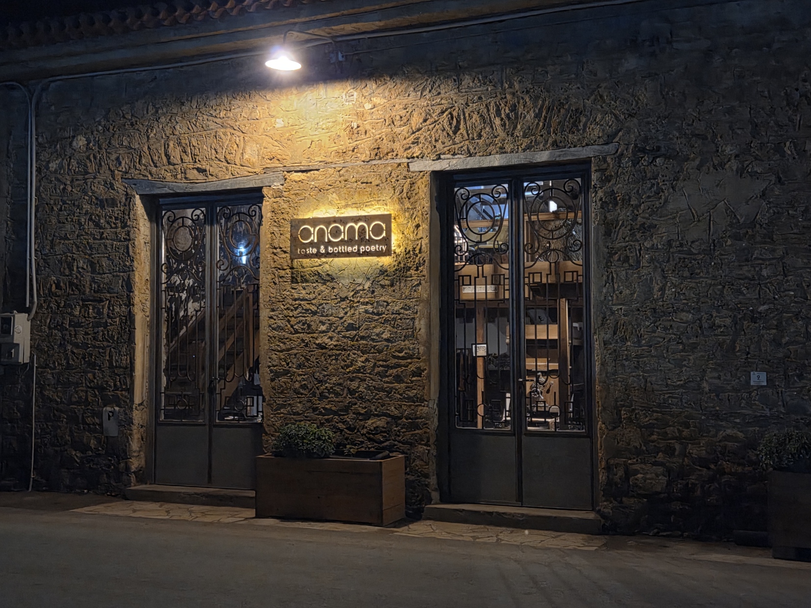Το εστιατόριο είναι πανέμορφο. Παλιές εγκαταστάσεις του ΑΣΟ (Αυτόνομος Σταφιδικός Οργανισμός), από τον καιρό που η δυτική Πελοπόννησος και η ευρύτερη περιοχή της Πύλου, γνώρισε την ευημερία της σταφίδας με τους γαλλικούς αμπελώνες να έχουν χτυπηθεί από τη φυλλοξήρα. Εκεί έφτιαχναν κι ένα γλυκό κρασί που το χρησιμοποιούσαν στη μετάληψη οι ιερείς. Το Άναμα ή Νάμα. Τα παλιά μηχανήματα παρέμειναν, ως εκθέματα με δραματικό φωτισμό. Το εστιατόριο είναι γεμάτο κυρίως από ξένους και ο Καραμολέγκος γνωρίζοντας πως κυρίως αυτό το κοινό ταΐζει, έχει διαμορφώσει ένα συνοπτικό εύκολο φαινομενικά μενού χωρίς πολλά φρου-φρου στις περιγραφές. Και είναι πάνω από τα πιάτα. Δεν έκανε απλώς μια επιμέλεια για να αφήσει το προσωπικό του να διεκπεραιώσει την εκτέλεση. Άλλωστε εκεί μένει μόνιμα (με τις πολλές γάτες και τα σκυλιά του), δεν έχει να φροντίσει προς το παρόν άλλο εστιατόριο.