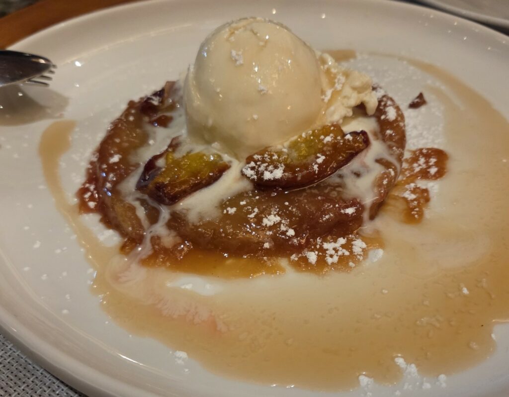 Στα επιδόρπια δοκιμάσαμε μια εκτός καταλόγου (και άνευ περιγραφής) tarte tatin με ιδανικά καραμελωμένα δαμάσκηνα και παγωτό δάφνης. Ίσως το καλύτερο επιδόρπιο με διαφορά που έχουμε δοκιμάσει εδώ και πολύ καιρό.