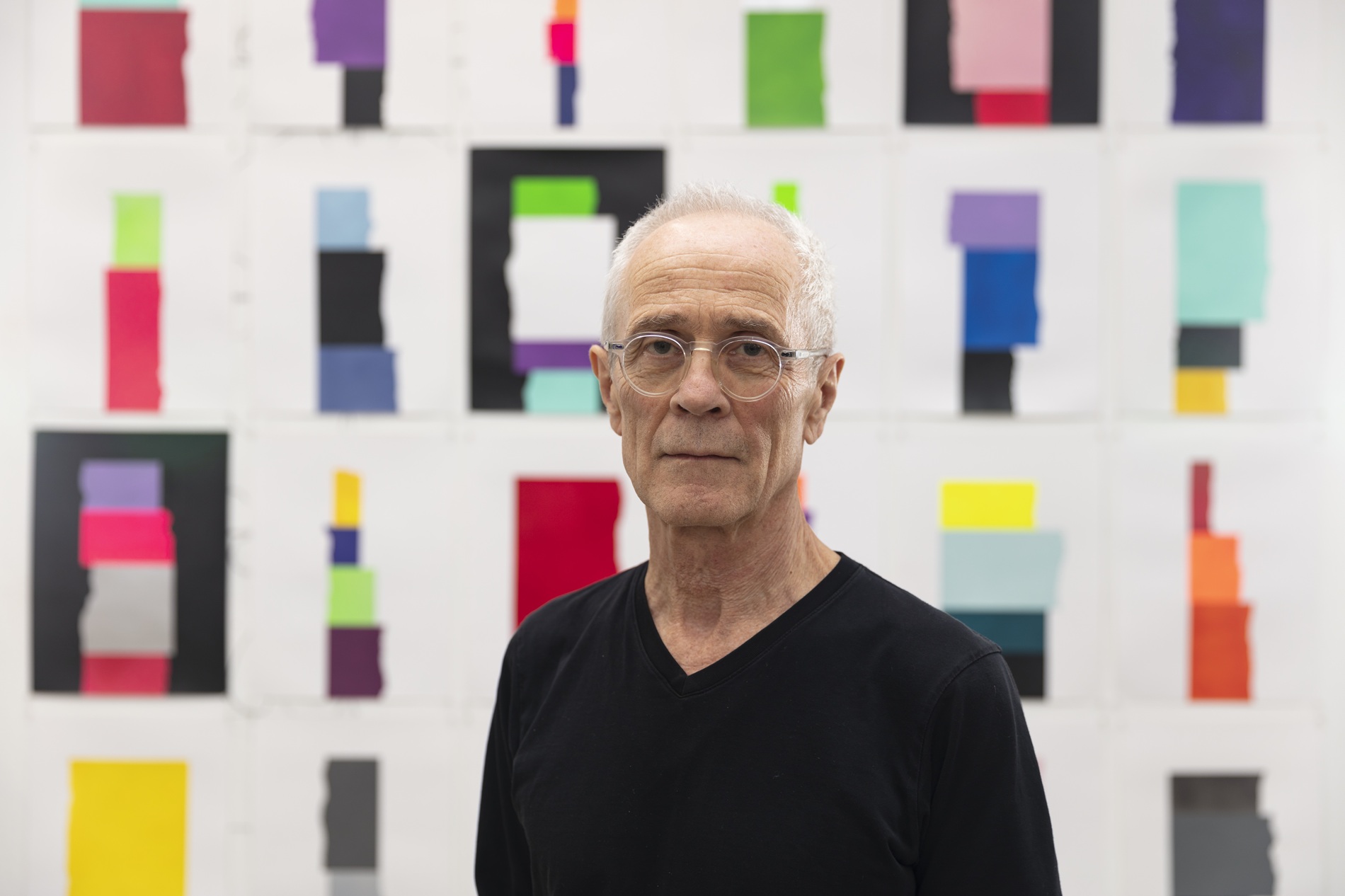 Στις γλυπτικές συνθέσεις του Concreto-Concreto 2025, το ακατέργαστο, έντονα κορεσμένο χρώμα φαίνεται να διαποτίζει τις τραχιές, εύθραυστες τσιμεντένιες φόρμες του David Batchelor (γεν. 1955).