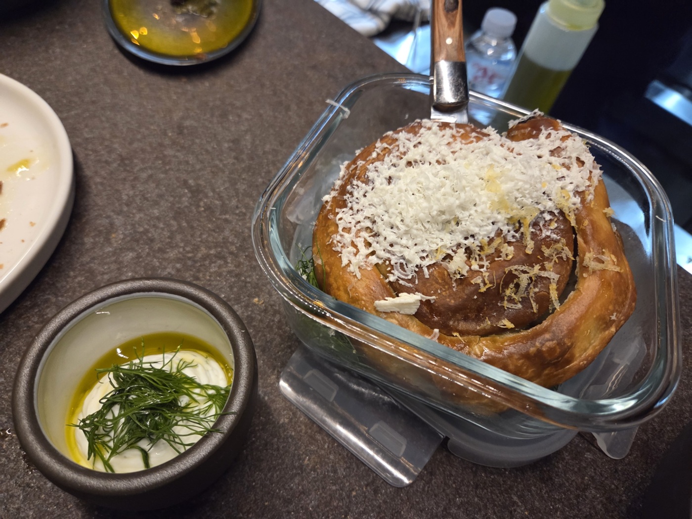 Το cinnamon roll με κόκορα παστιτσάδα και κρέμα μετσοβόνε, είναι δυναμίτης. Πλούσιο και ρουστίκ πιάτο με γεύση «πάρε να ‘χεις / ω να σου», που συνεπάγεται και κάποιο ρίσκο για τη γευστική ένταση των επόμενων πιάτων.