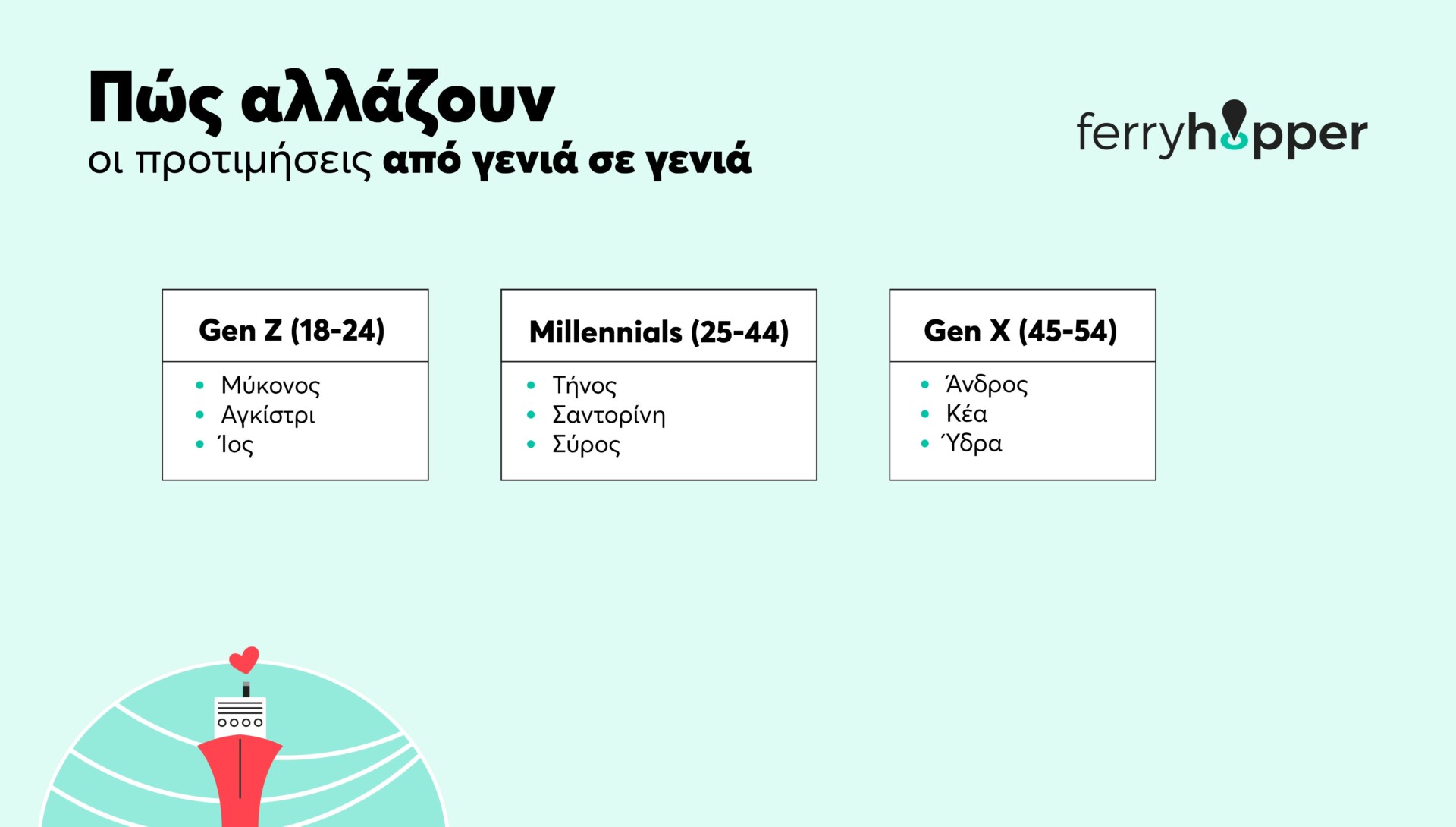 Η Αίγινα, η Πάρος και η Νάξος ήταν τα πιο δημοφιλή νησιά για το 2025, ωστόσο κάθε ηλικιακή ομάδα είχε διαφοροποιήσεις. Η Gen Z (18-24) προτίμησε επίσης νησιά με εύκολη πρόσβαση στην Αθήνα και νυχτερινή ζωή, όπως η Μύκονος, το Αγκίστρι και η Ίος, ενώ οι Millennials (25-44) ταξίδεψαν επίσης σε πιο κλασικές επιλογές των Κυκλάδων, όπως η Τήνος, η Σαντορίνη και η Σύρος.