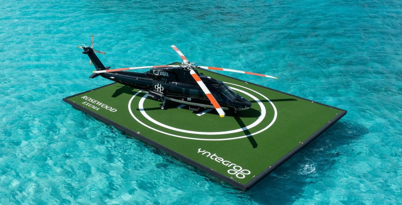 Την καινοτόμο κατασκευή υπογράφει η Yntegra Group, κατασκευαστικός και αναπτυξιακός όμιλος με έδρα το Μαϊάμι, η οποία φιλοδοξεί να επαναπροσδιορίσει την έννοια της άφιξης σε έναν απομονωμένο, υπερπολυτελή προορισμό. Το κινητό πλωτό ελικοδρόμιο, συνολικής επιφάνειας περίπου 202 τετραγωνικών μέτρων, θα δίνει τη δυνατότητα στους επισκέπτες να προσγειώνονται απευθείας πάνω στα κρυστάλλινα νερά του αρχιπελάγους Εξούμα.
