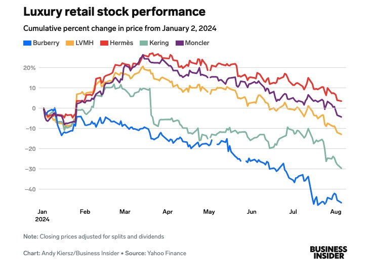 Δεν είναι μια εύκολη εποχή για την υψηλή μόδα, αλλά στον Burberry οι αναταράξεις υπήρξαν ακόμη μεγαλύτερες. Με -49%, η μετοχή του έχει σημειώσει τις χειρότερες απώλειες από τις αρχές του έτους, σε σύγκριση με οποιοδήποτε άλλο από τα μεγάλα σήματα πολυτελείας.