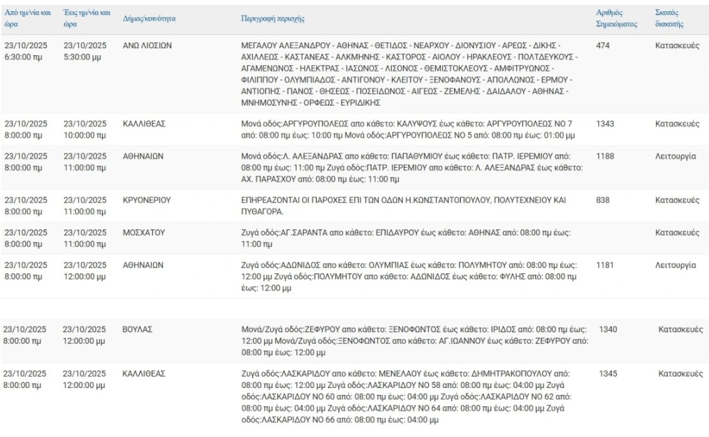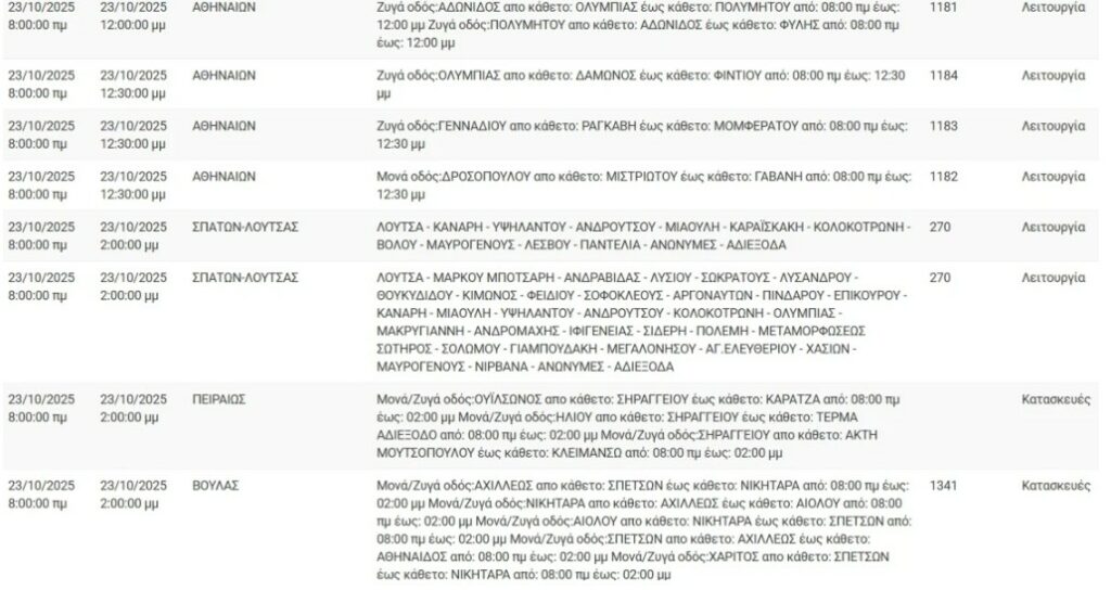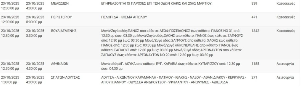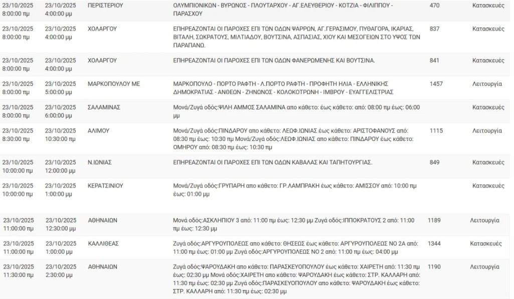 Σε προγραμματισμένες διακοπές ηλεκτροδότησης σε διάφορες περιοχές της Αττικής προχωρά σήμερα, Πέμπτη 23 Οκτωβρίου, ο Διαχειριστής Ελληνικού Δικτύου Διανομής Ηλεκτρικής Ενέργειας (ΔΕΔΔΗΕ), όπως ανακοινώθηκε επίσημα.