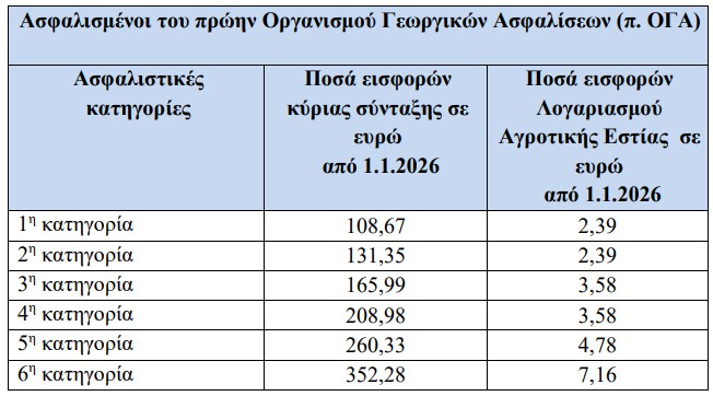 Όσον αφορά τις εισφορές κύριας ασφάλισης των αγροτών, θα ανέλθουν στα 108,67 ευρώ, ενώ οι εισφορές υγείας στα 38,21 ευρώ (1η κατηγορία).