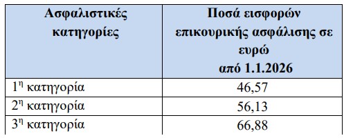 Οι εισφορές επικουρικής ασφάλισης θα ανέλθουν στα 45,67 ευρώ (1η κατηγορία), ενώ του εφάπαξ σε 31,05 ευρώ (1η κατηγορία).
